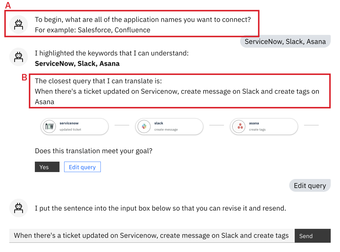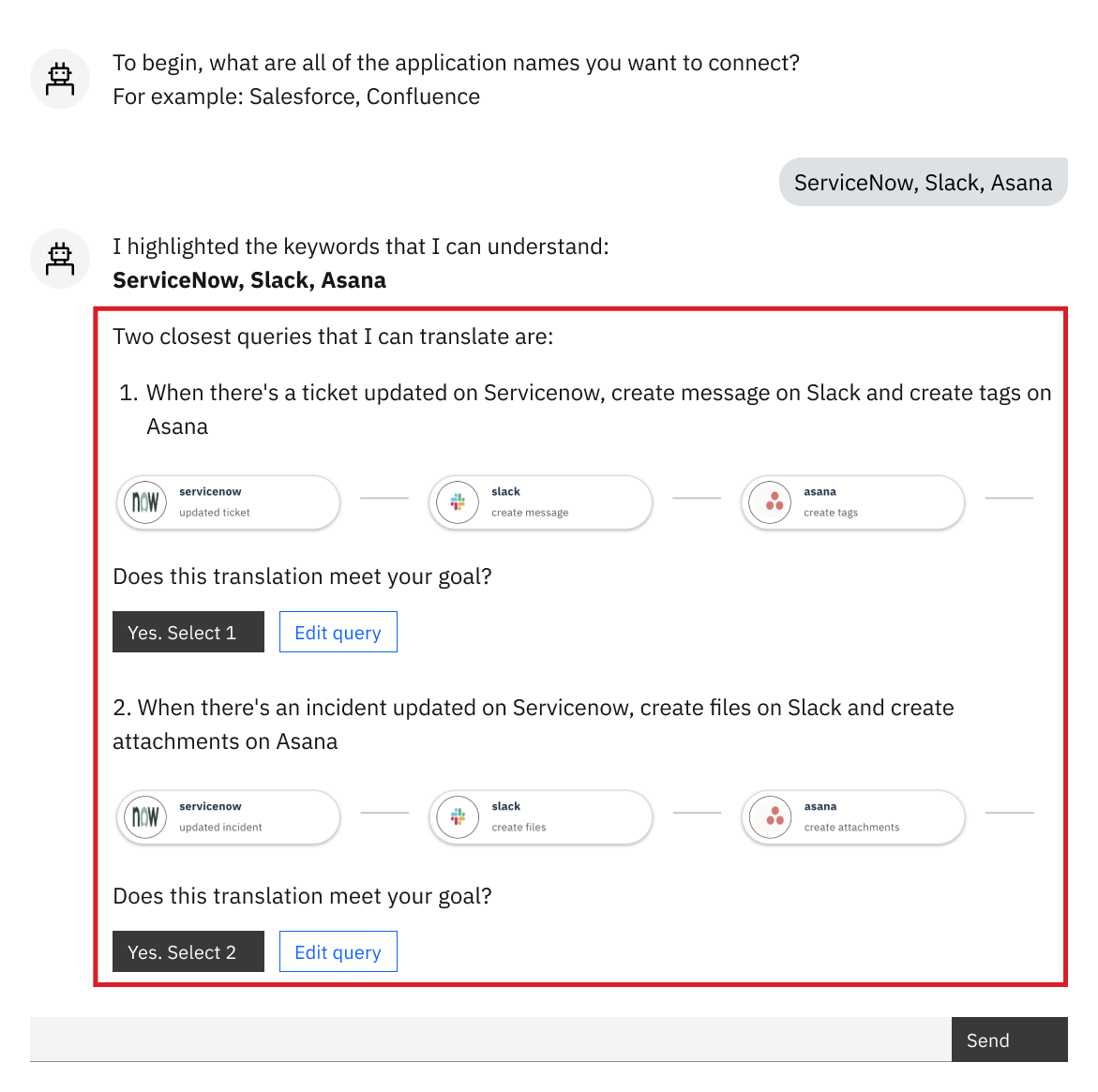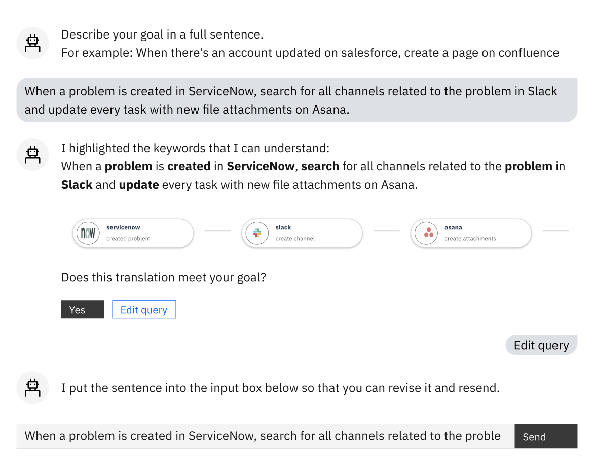 For example, a user might type, “When there is a new incident on ServiceNow, send me a message on Slack and an email to my Gmail account,” and automate the workflow between ServiceNow, Slack, and Gmail.